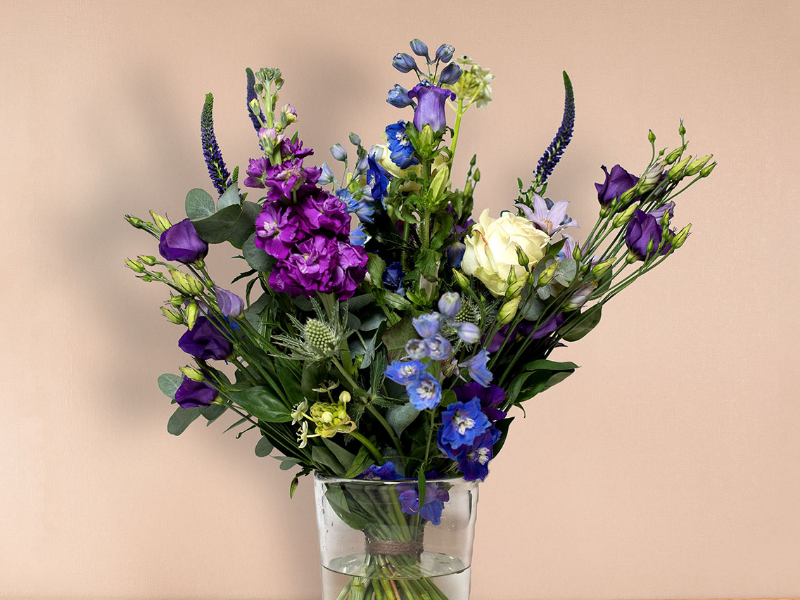 Hoera een jongen! Stoer boeket met blauwe/paarse bloemen. Kleuren mogelijk niet altijd op voorraad.