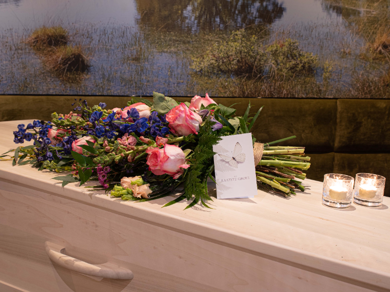 Een liggend boeket is een alternatief voor een gestoken bloemstuk, deze boeketten zijn zonder water en worden veelal op de dag van de uitvaart/crematie op of bij de kist gelegd. Getoonde formaat is middel.